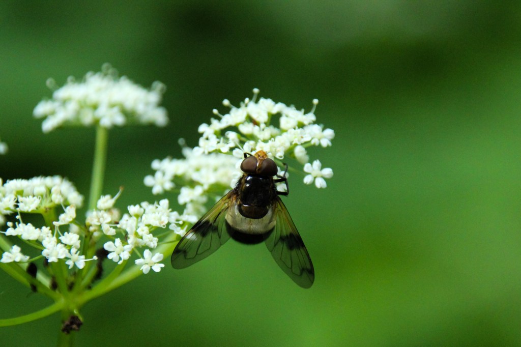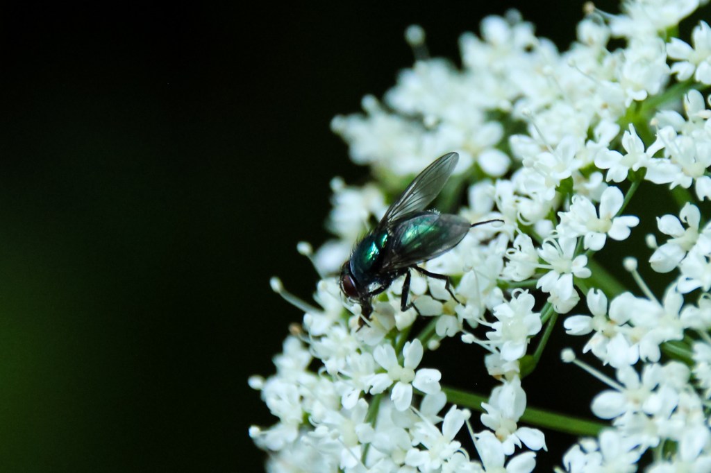 Nach was genau ich Ausschau hielt war mir also selbst nicht ganz so klar, irgendwie war ich planlos, ziellos. Aber dann fiel mein Blick ganz unverhofft und überraschend auf diese hübsche , kleine Fliege die sich da am Wegesrand an einer Gierschblüte gütlich tat.