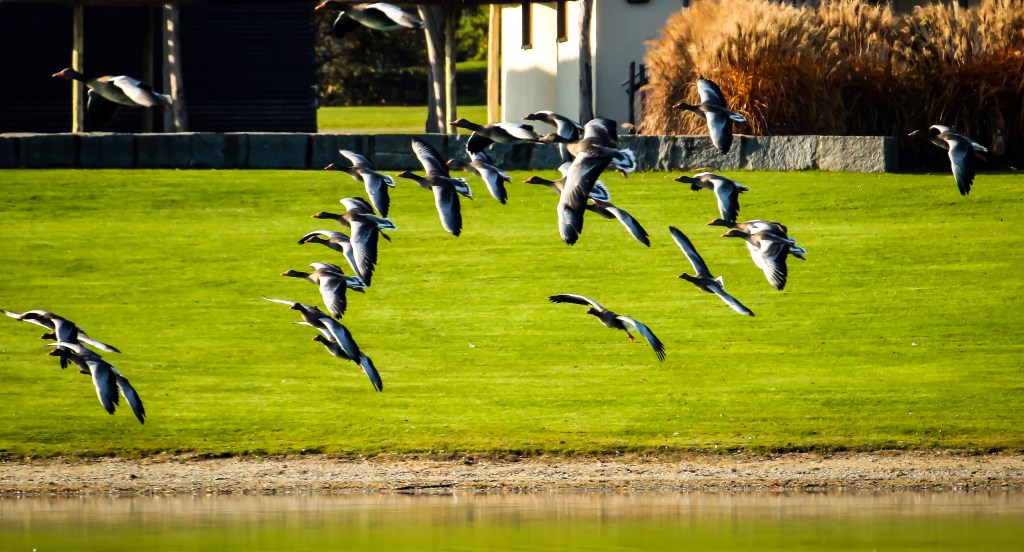 Graugänse sind echte Überlebenskünstler, auf der Suche nach Nahrung und einem sicheren Platz zum Überwintern legen sie zum Teil Strecken von über 1000 Kilometern zurück. Um Krisensituationen unbeschadet überstehen zu können, um Gefahren auszuweichen, nutzen sie ihr außerordentliches Sozialverhalten. Wenn sie rasten halten einige Vögel Wache und warnen ihre Artgenossen, wenn Feinde sich nähern. Auf ihren langen Routen fliegen sie in Keil-Förmigen Formationen. An der Spitze wechseln sie sich ab, die anstrengende Führungsaufgabe übernehmen immer diejenigen, die über das größte Wissen angesichts der drohenden Gefahr verfügen. Diejenigen die ihre Stärken in anderen Bereichen wissen, vertrauen sich dieser Leitung bedingungslos an……und kommen so sicher an`s Ziel…..