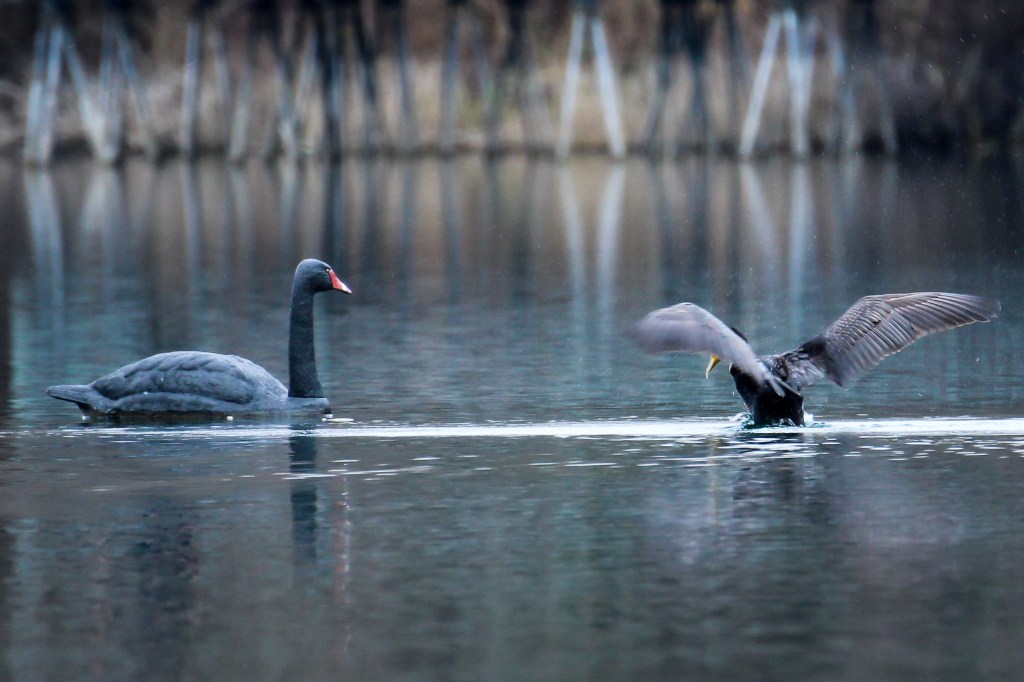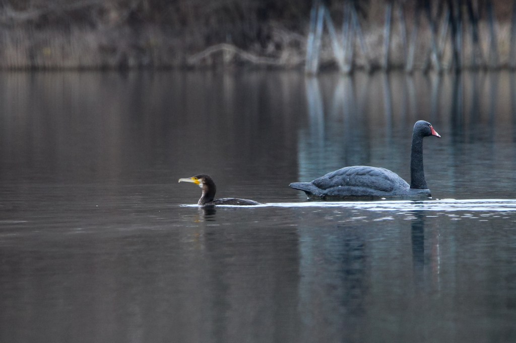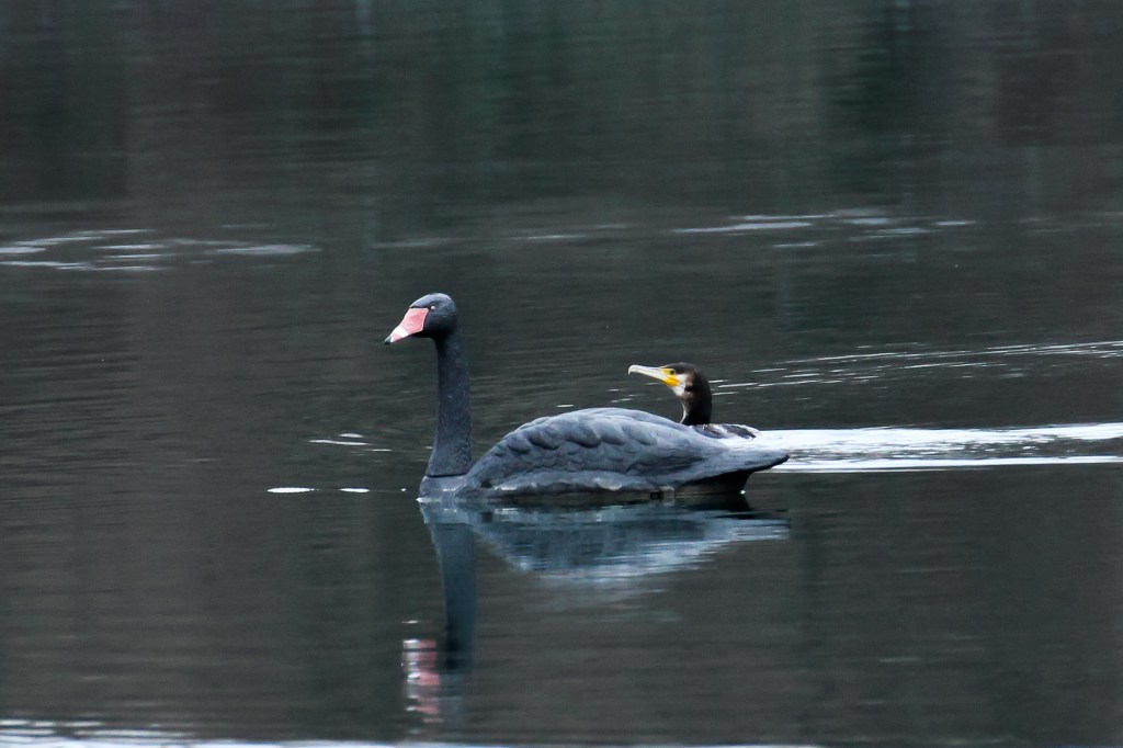 Wie erstaunlich, dass sich gerade heute ein einsamer Trauerschwan hierher verirrt hat…… Und noch erstaunlicher, wen er da an seiner Seite hatte…..