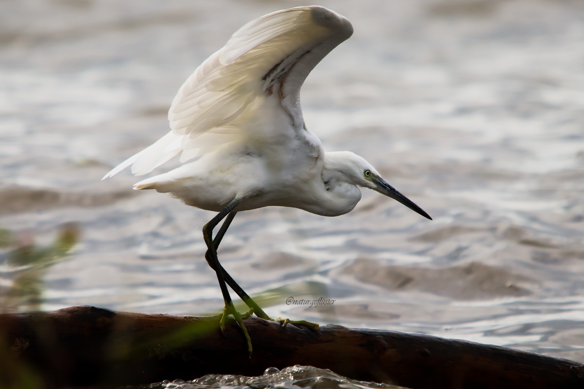 Ein kleiner, zierlicher Seidenreiher war es, der da zunächst in anmutigem Flug an mir vorbei gesegelt ist, nur um sich dann, ein kleines Stück vom Ufer entfernt und natürlich in gebührendem Abstand zu mir, auf einem Stückchen Schwemmholz niederzulassen.